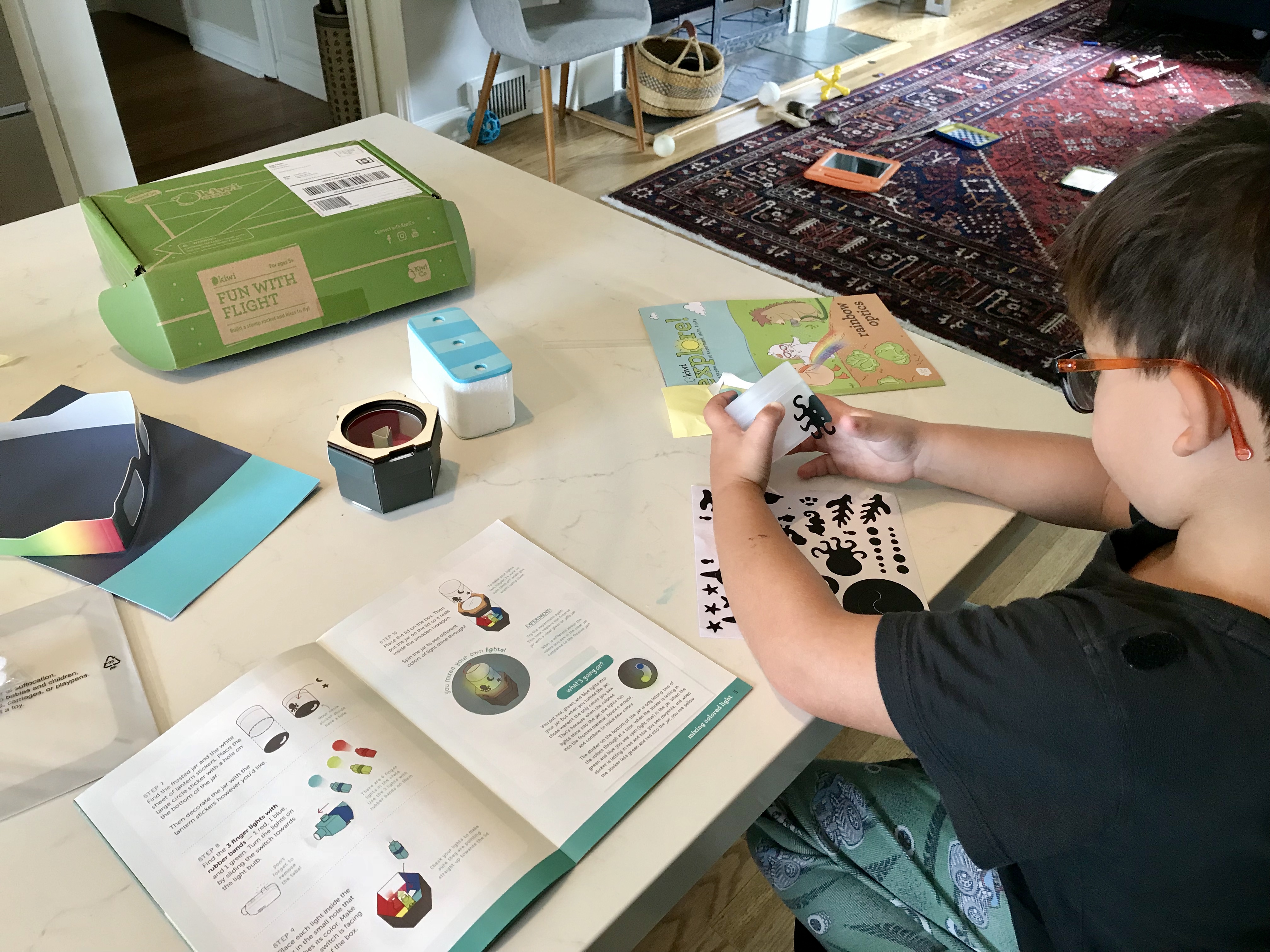 We’ve done light refraction, projection with different colored lights (see video), probability and each time the box comes my son gets excited. We do these on the weekend (after I’ve had several cups of coffee) and he looks forward to it every time the box comes in the mail.