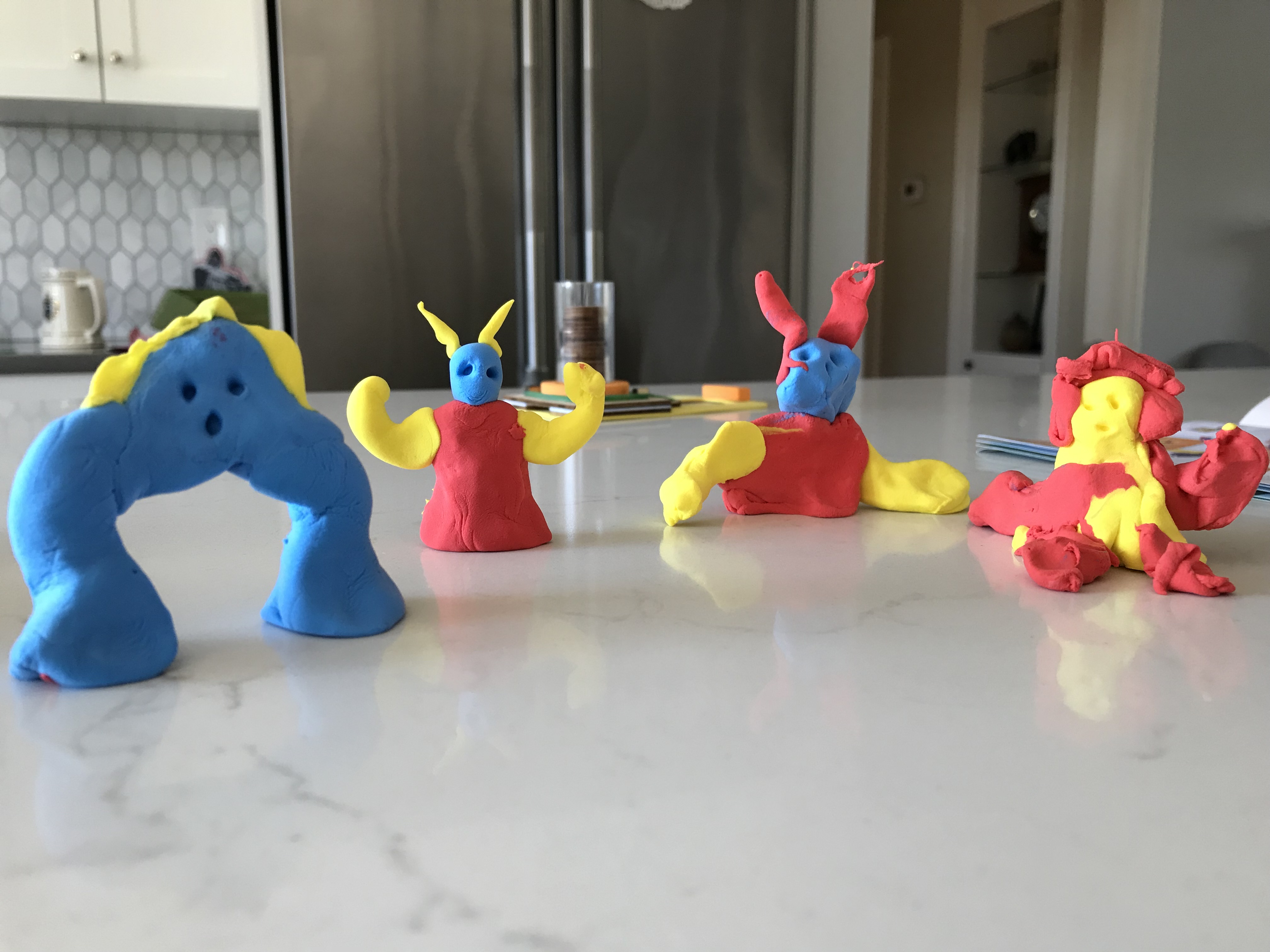 The beauty of this one: it comes with the dry clay you can mold into the shape of figurines. Then, you use a disk shooter is used to try to knock them down. We have an island in our kitchen, which was perfect to use.