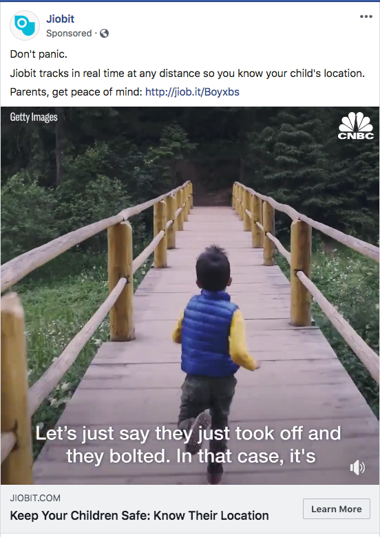 The CEO of JioBit, John Renaldi, was featured in the ad I watched on Facebook. Here’s a screenshot I captured, where he asks a parent what would happen if, “they just took off and they bolted…”