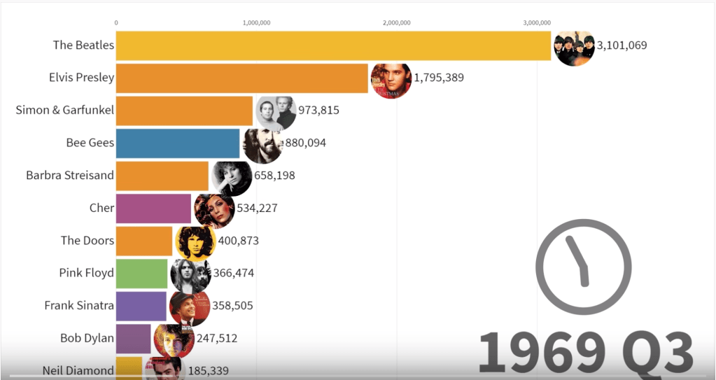 1969: The summer of love, when everyone was on the pill, having sex at Woodstock, and dropping LSD in San Francisco… activities I would never recommend to my son, Connor. But, The Beatles are on top to no one’s surprise. Elvis is still the king and honorable mentions are due to the likes of The Doors, Pink Floyd, and Santana.