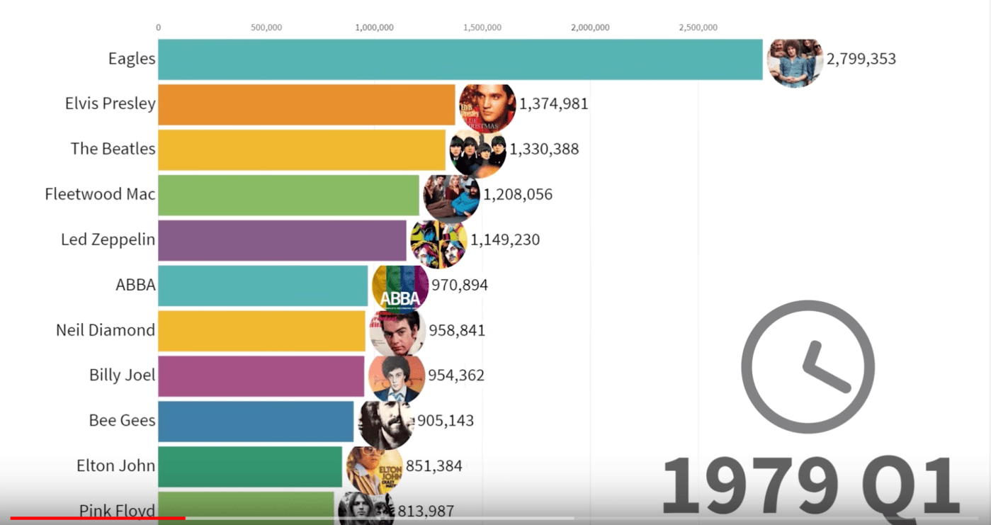 1979: At the height of the Disco era, it’s good to see The Eagles on top. Elvis is still…. STILL in the top ten at #2, which is impressive. The Beatles are still there, Fleetwood Mac and Led Zeppelin are rocking album sales too, the latter representing one of rock & roll’s greatest bands. But, there’s Abba, Neil Diamond, and The Bee Gee’s. You can make the case that all of these artists are talented but R&R, during the late 70s, continued to play a major role.