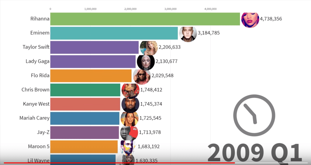 2009: There are no R&R artists in the top ten. Seven of them are Hip Hop artists. Baby Boomers are probably buying The White Album for the 5th time but that band is long gone in terms of album sales. We can confirm Elvis’s death, albeit he can still be seen on the streets of Las Vegas. There’s a clear move away from amps, snare drums and Fender Guitars. R&R, in 2009, represented an older genre of music compared to what young music enthusiasts were buying.