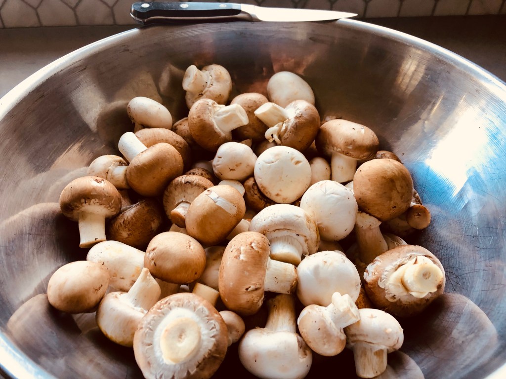 This dish requires two pounds of mushrooms. Don’t buy them pre-sliced, that represents a waste of money and it’s easy enough to wipe each one down with a damp paper towel and slice them. Mix them up between white button and brown bell mushrooms.