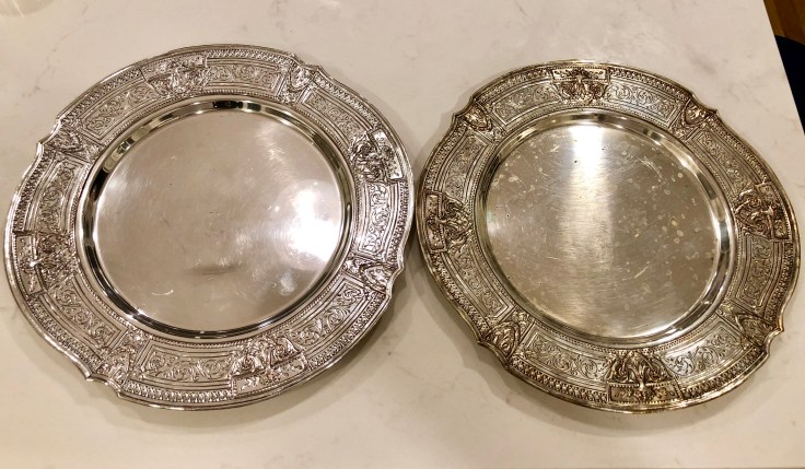 I took out another piece from the cardboard box the following evening. The process did not get easier—some items took over an hour to complete. One of the most amazing finds was a set of silver chargers, which are used beneath a served plate of food at formal occasions. This piece required me to use Q-Tips to get into the intricate parts of the dish.