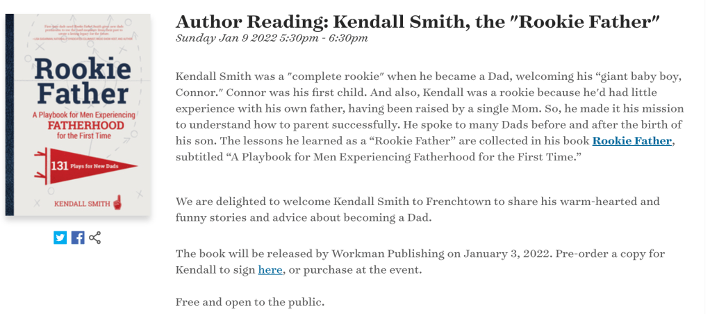 I’m excited to announce I’ll be speaking and signing copies of Rookie Father in several months time. I invite you to check out Frenchtown Bookshop and event details can be found here.